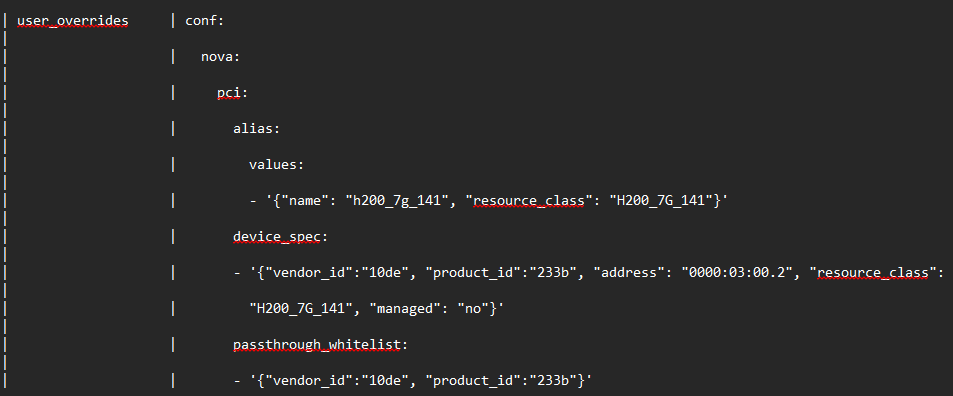 [pci] device_spec = {"address": "0000:03:00.2", "resource_class": "H200-vf", "managed": "no", "remote_managed": "true"} device_spec = {"address": "0000:03:00.3", "resource_class": "H200-vf", "managed": "no", "remote_managed": "true"} device_spec = {"address": "0000:03:00.4", "resource_class": "H200-vf", "managed": "no", "remote_managed": "true"} device_spec = {"address": "0000:03:00.5", "resource_class": "H200-vf", "managed": "no", "remote_managed": "true"} alias = {"name": "ah200-vf", "device_type":"type-VF", "resource_class": "H200-vf"}